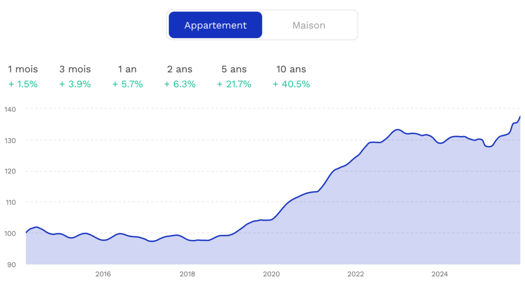 👉Notre analyse rapide : Cette progression indique un marché “porteur” à l’échelle du temps long, même si les cycles existent : taux, pouvoir d’achat, offre disponible, etc.