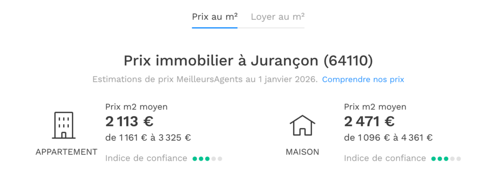 Prix au m² à Jurançon selon le type de bien (janvier 2026)