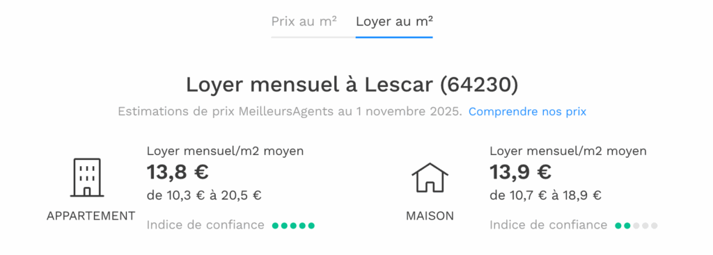 Selon MeilleursAgents (novembre 2025), Lescar affiche des prix cohérents pour une commune résidentielle aussi recherchée.