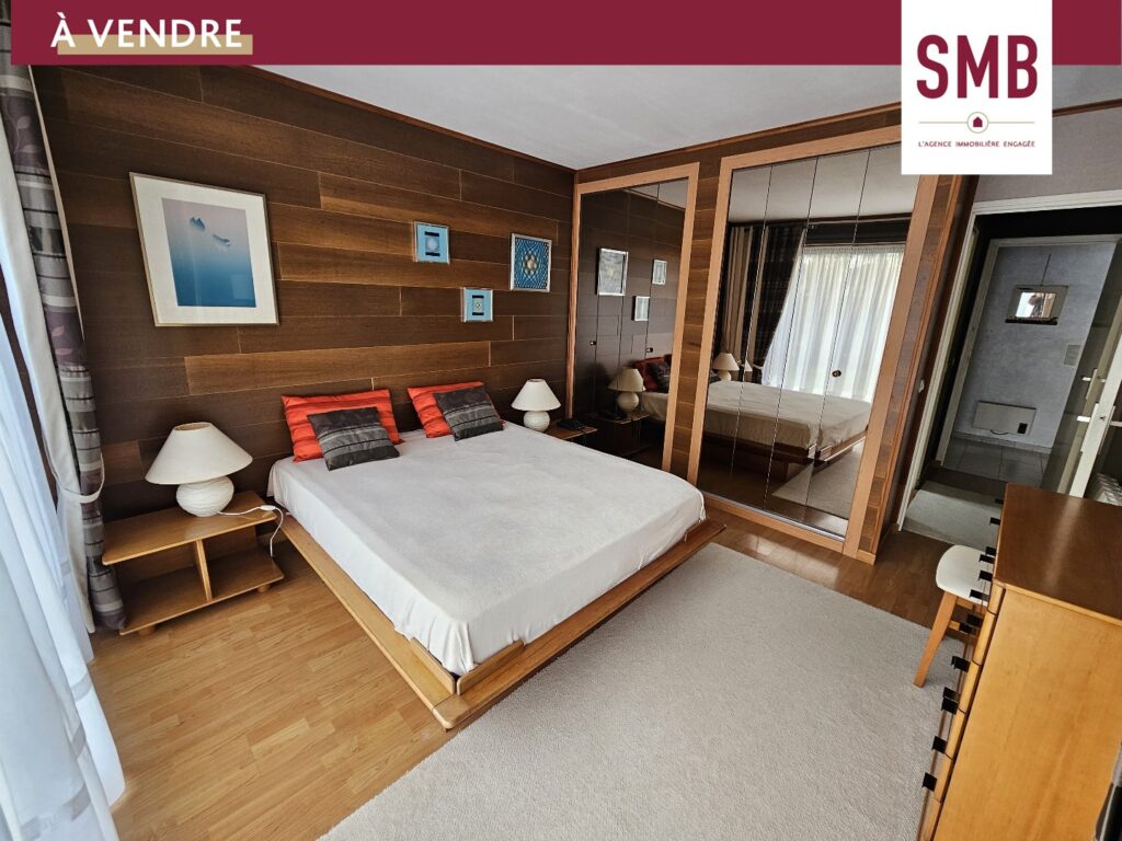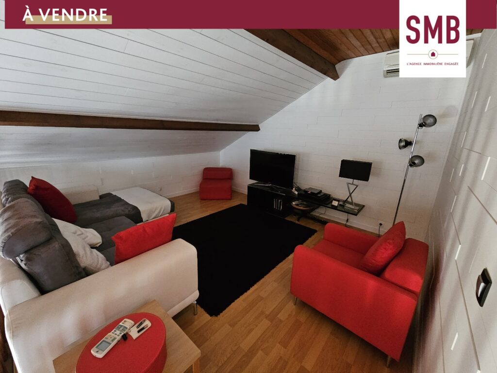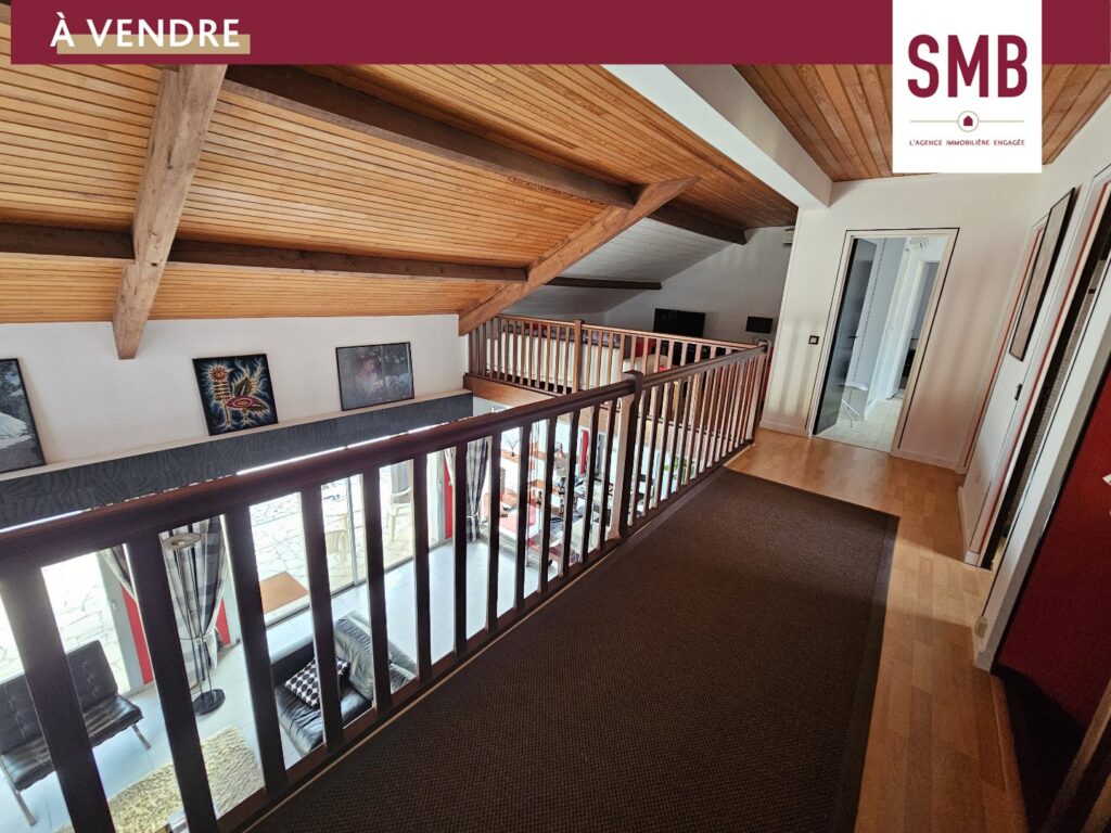 À l’étage, un espace agréable et fonctionnel comprend deux chambres, un bureau, une salle de bain, des WC séparés et une pièce mezzanine offrant une vue imprenable sur la pièce de vie.